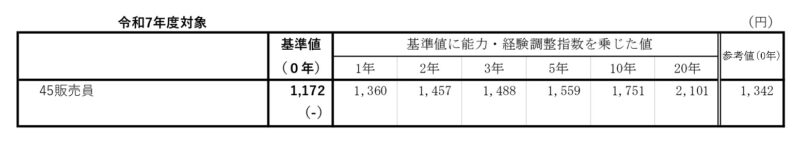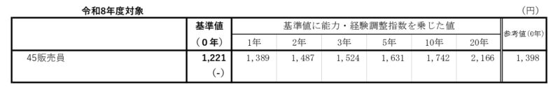 例えば【商品販売の職業】の令和7年度、8年度の比較をすると、基準値(0年)ベースで49円(1,221円-1,172円)、1年数値では29円(1,389円-1,360円)も上昇しています!